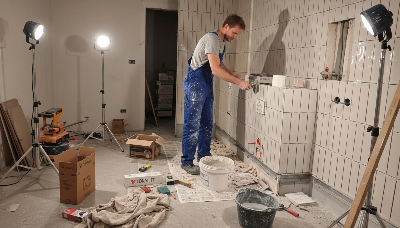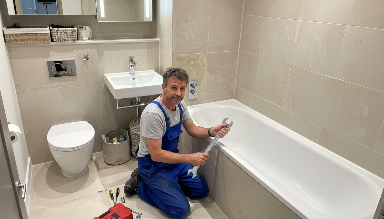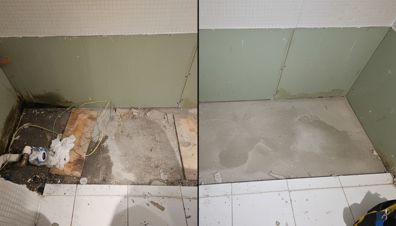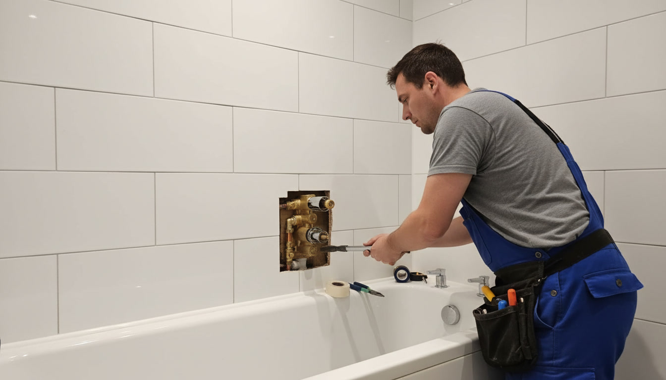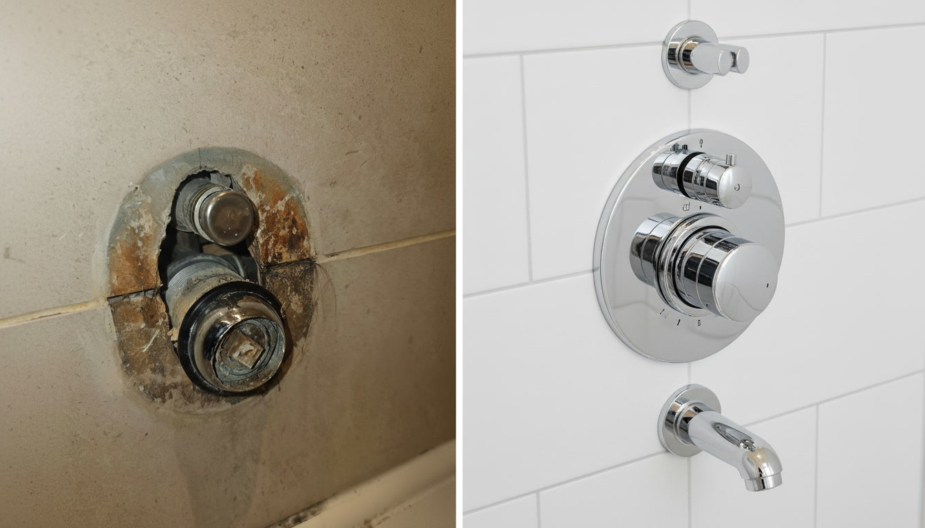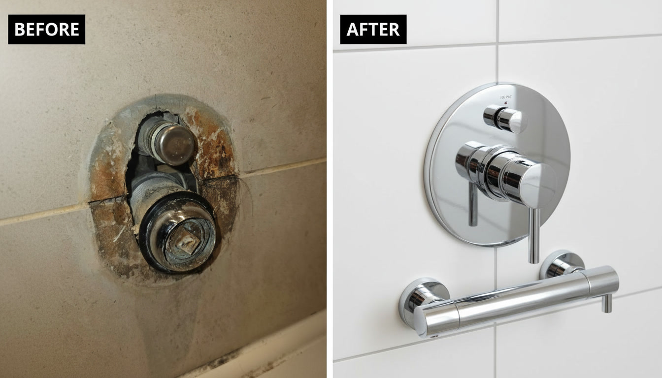 Comparison showing an old, damaged shower valve replaced with a modern chrome mixer control.