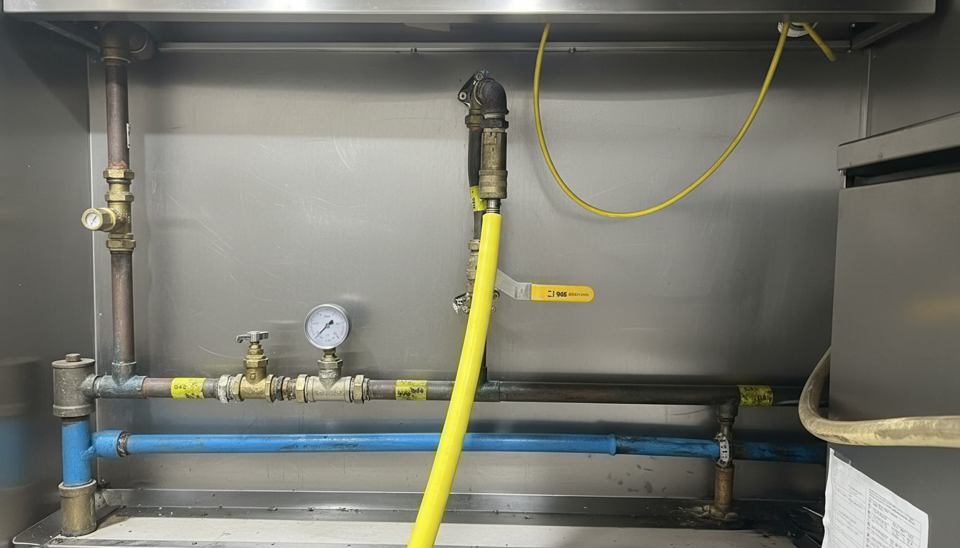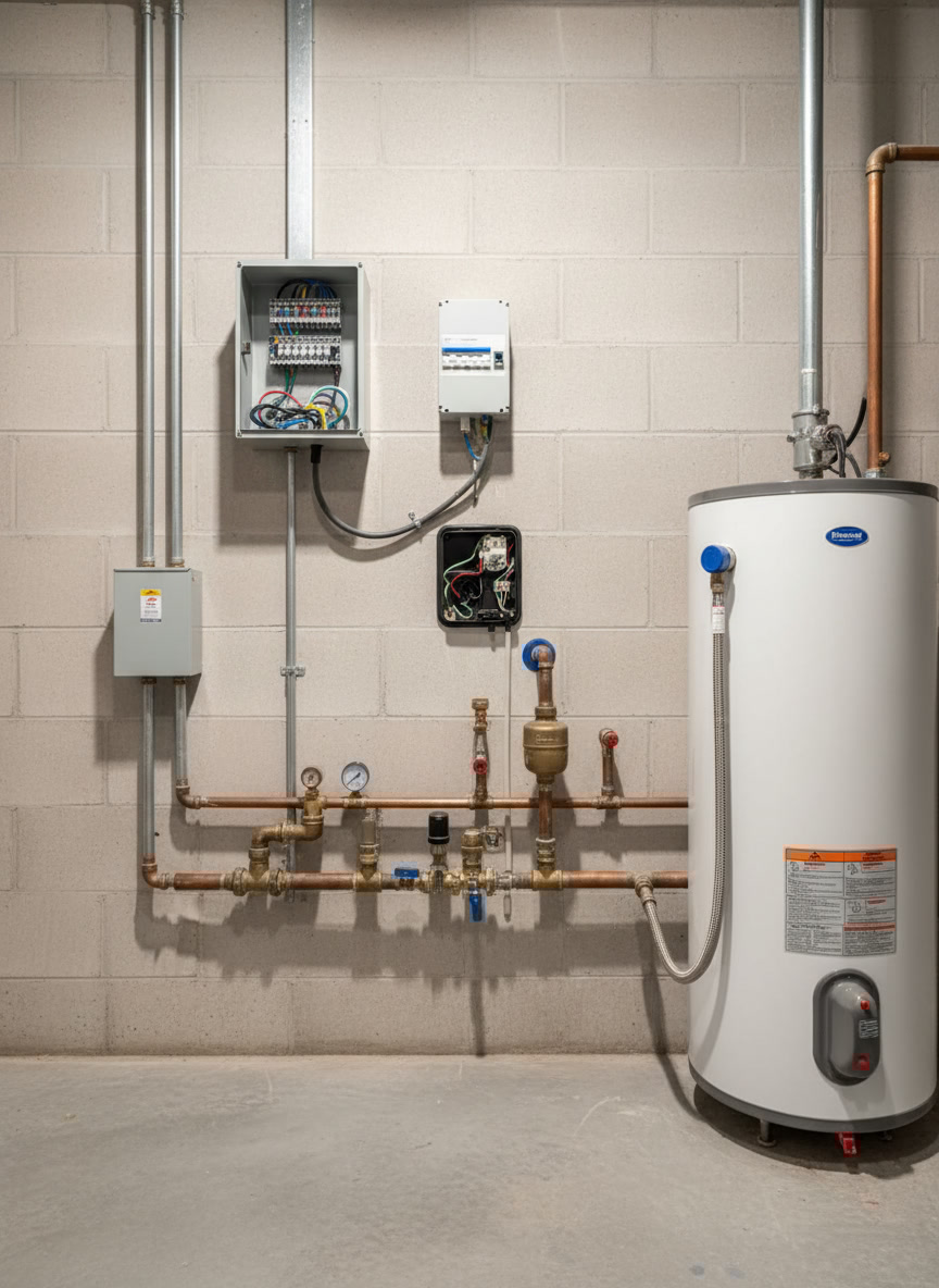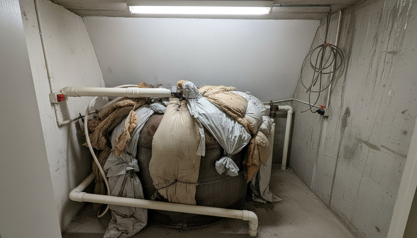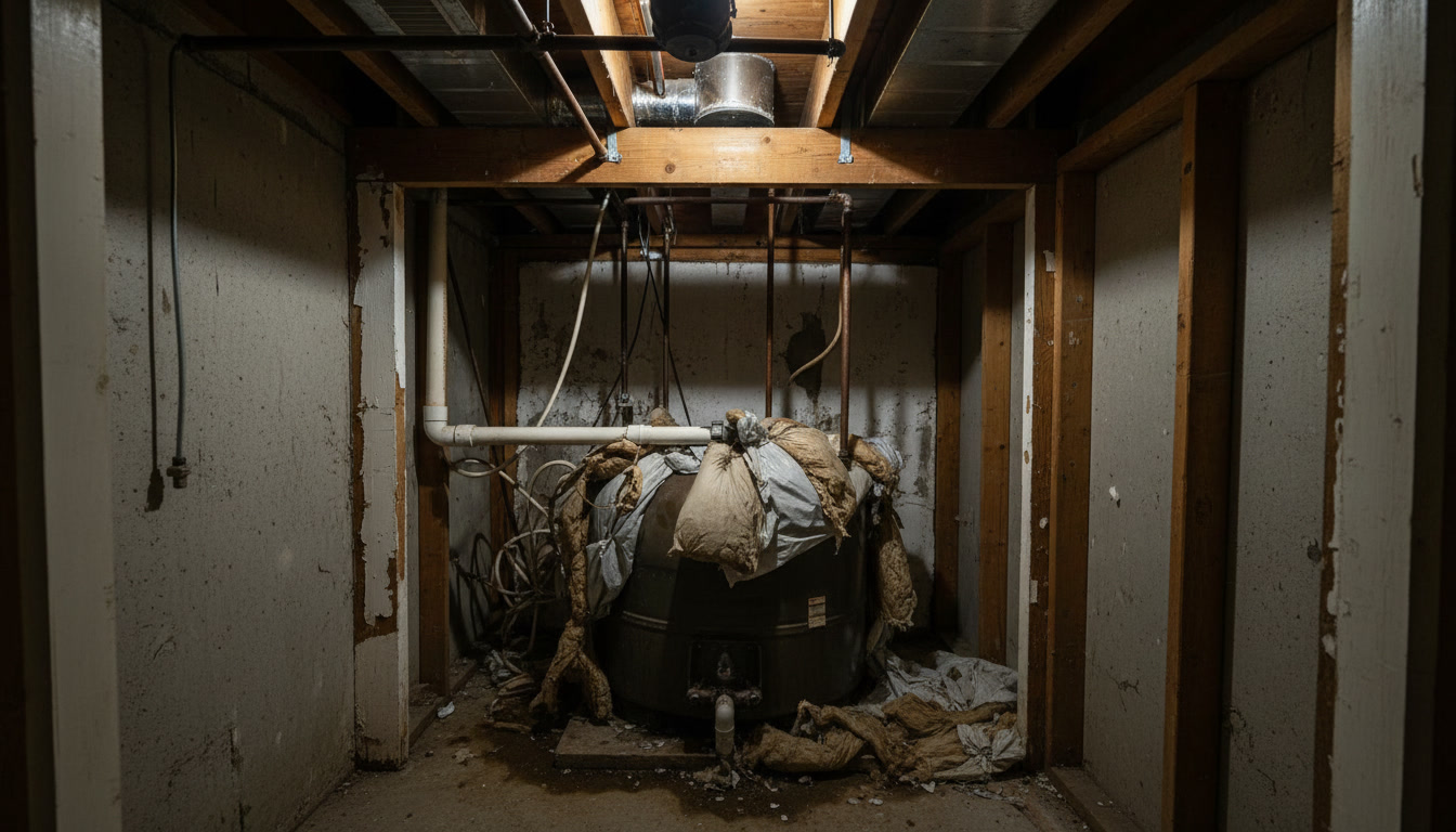 An old water heater located in a basement, surrounded by exposed pipes, insulation, and structural framing.