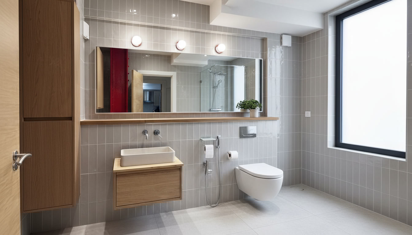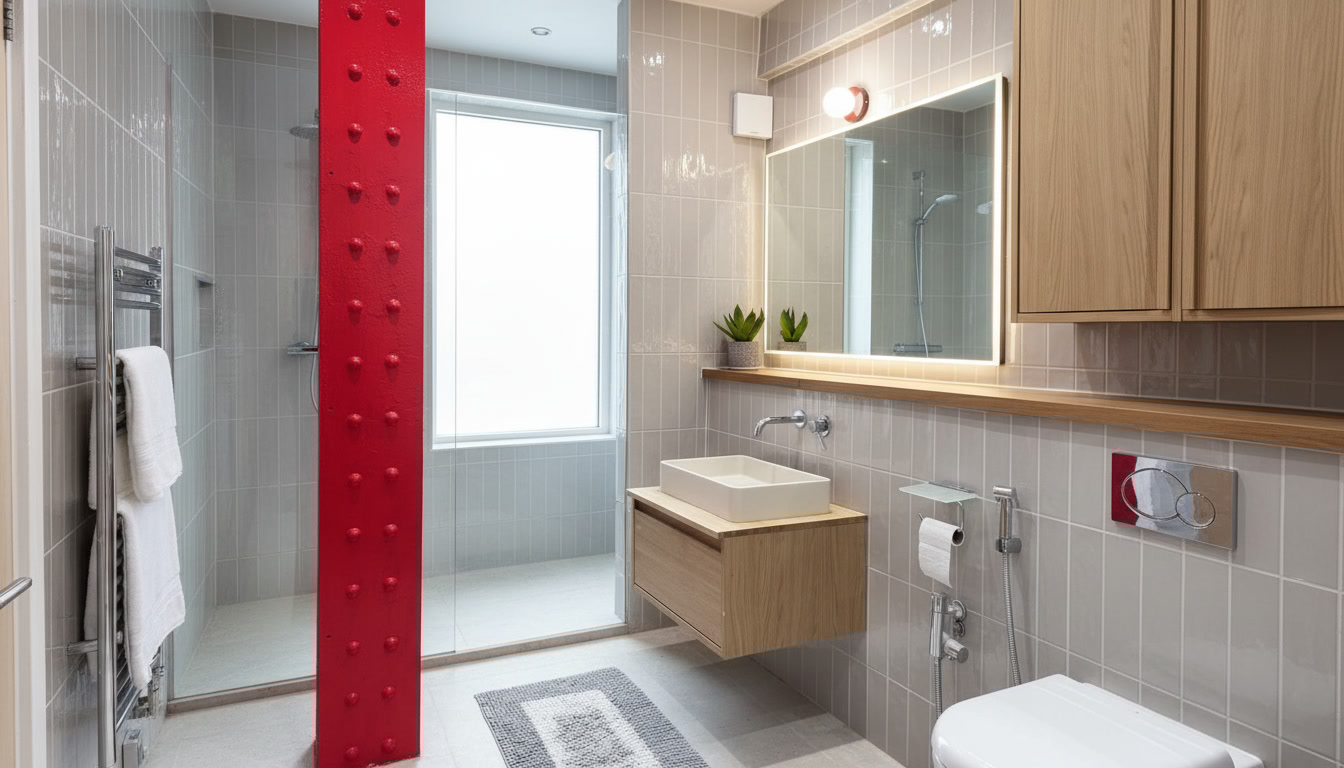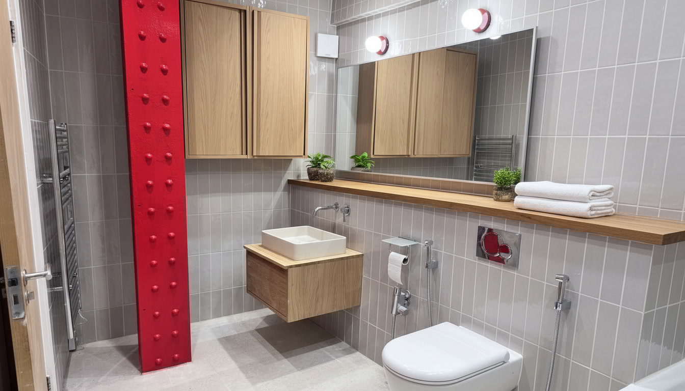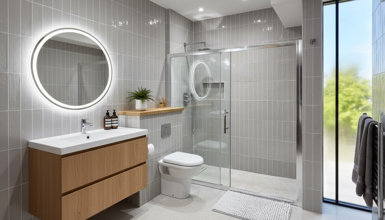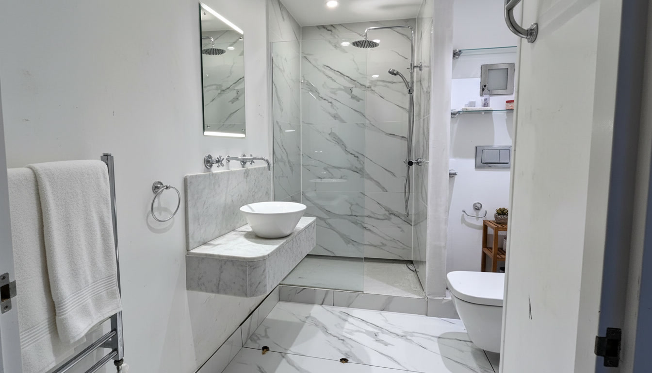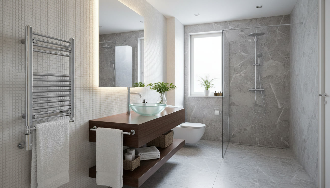 A modern bathroom featuring a glass walk-in shower, floating wooden vanity with vessel sink, and heated towel rail.