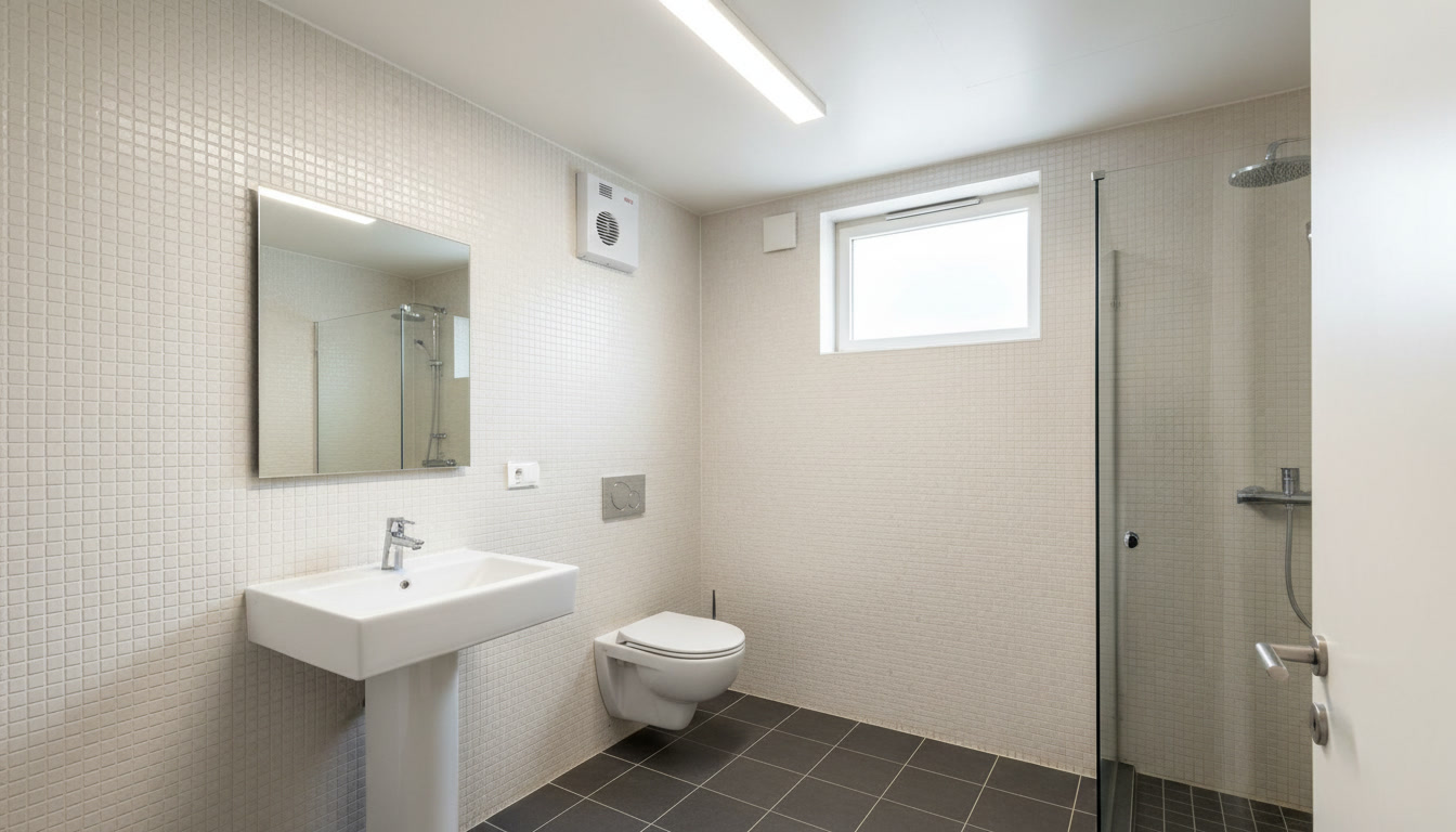 A clean, minimalist bathroom featuring a pedestal sink, wall-mounted toilet, and glass shower enclosure.